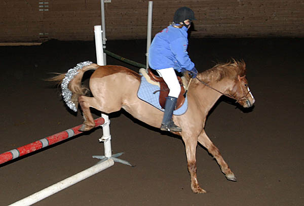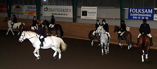 ![]() Lagtävling i hoppning på tid. Gymnasisterna mot ponnyryttare. Ponnylaget vann. |